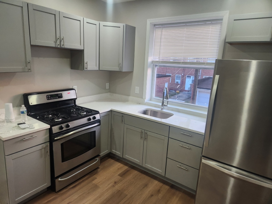 The updated kitchen includes sleek gray cabinetry, stainless-steel appliances, gas range, and quartz countertops perfect for everyday cooking or entertaining.