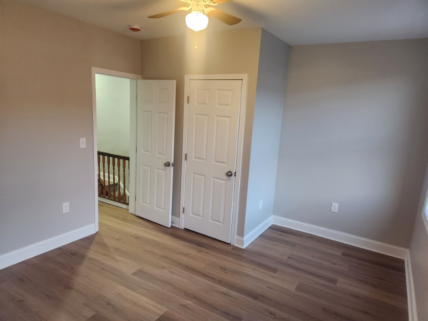 Upstairs, you’ll find two comfortable bedrooms with ceiling fans and a modern full bath with marble-style tile and built-in shower niche. The third bedroom is conveniently located on the main level, offering flexibility as a guest room, office, or playroom.